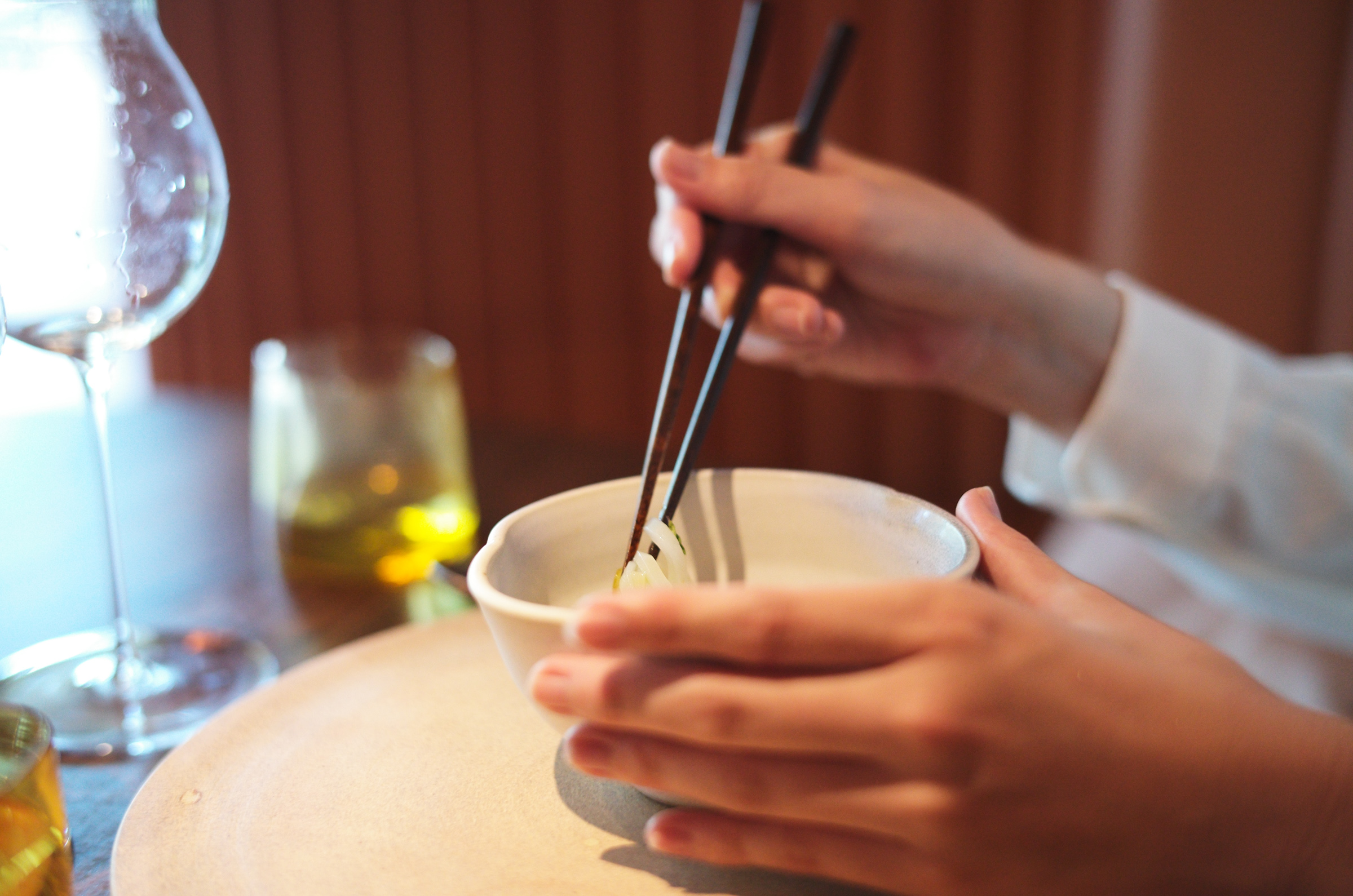 お次は烏賊そうめん的な一皿。柑橘とバジルで爽やかに、そして隠し味に白味噌。箸でいただきます。