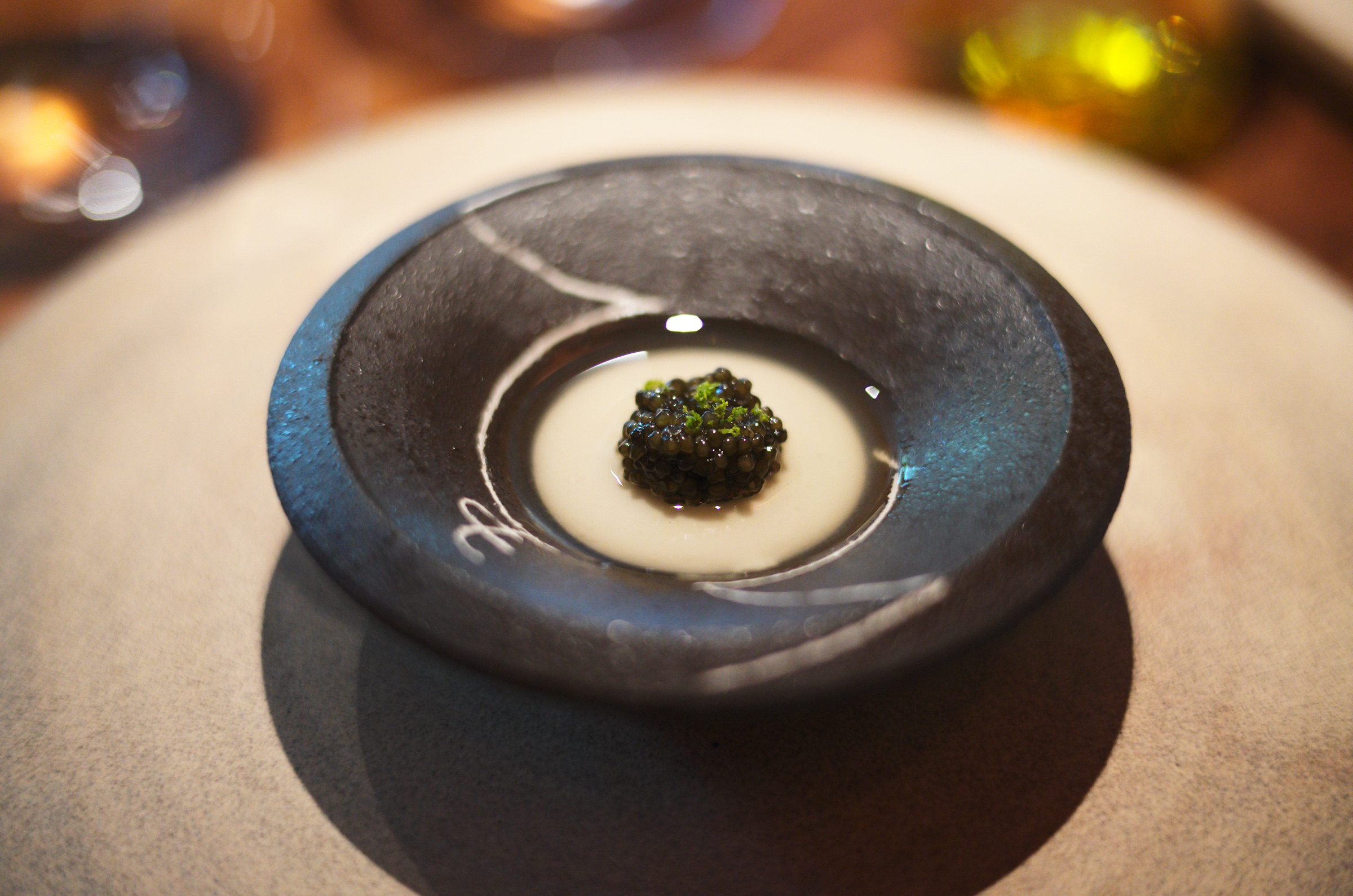 ココナッツのプリンにマカデミアオイル、そしてN25キャビア。こちらも面白い。日本人的には胡麻豆腐のような味わい。まったりと濃厚な口当たりでありつつどこかさっぱり。こういうところのキャビアって、メイン食材というよりも旨味と塩味を足す高級調味料の印象。
