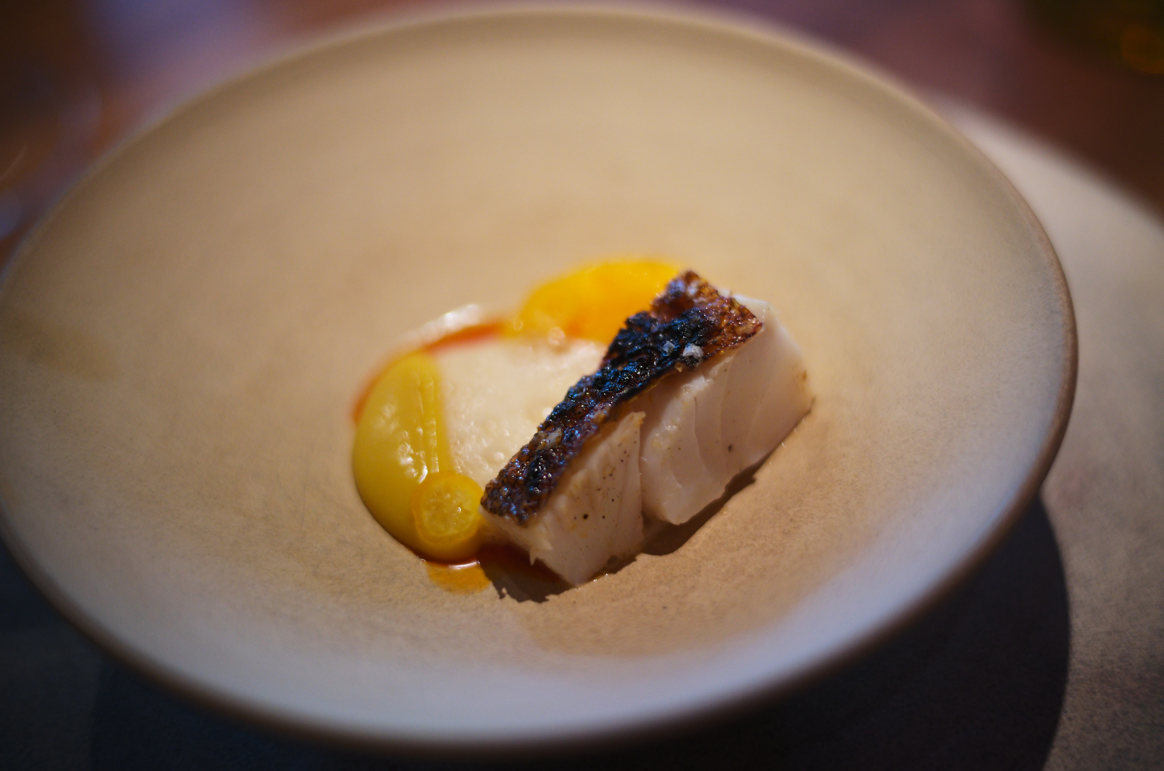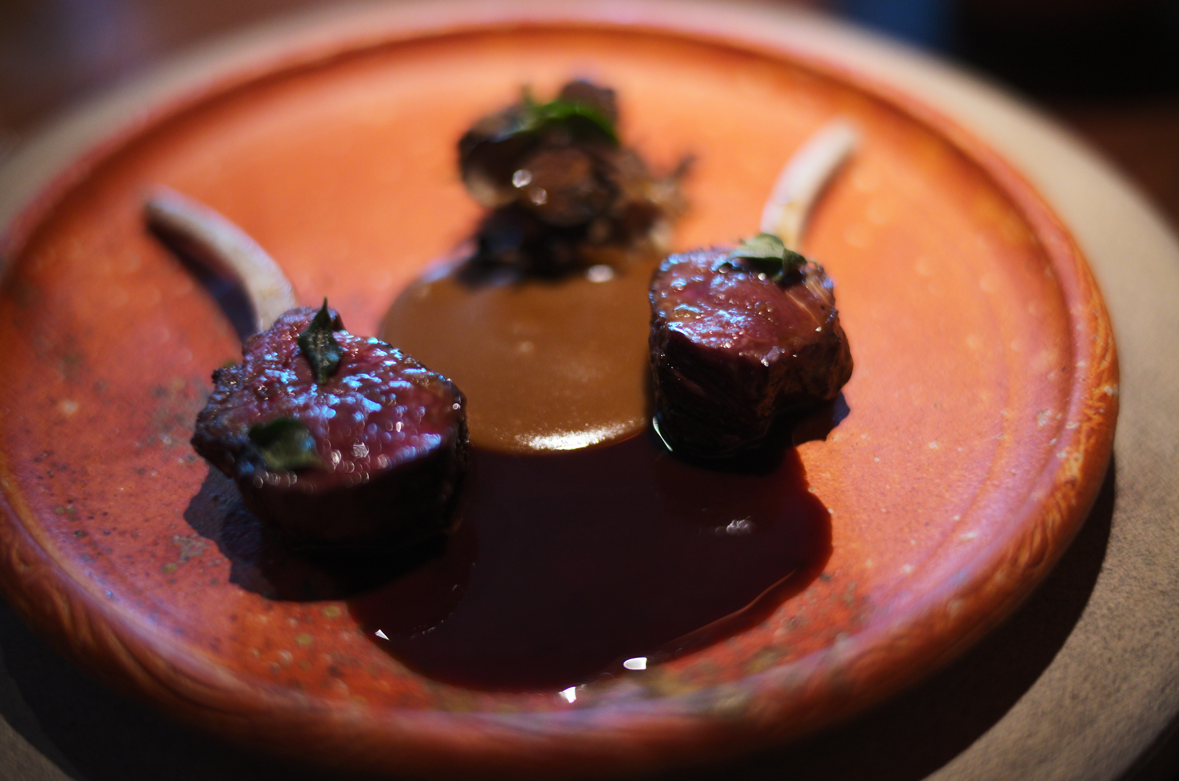 お次はコーラルトラウト(オーストラリアのサンゴ礁に生息する高級ハタ)とマンゴー、ブラッドライム。個人的には魚料理といえばやはり日本であり、海外で魚を食べて感動することは少ないのだが、コーラルトラウトは旨みが強く、しっとりと上品であり大変美味しい。マンゴーや柑橘のニュアンスも、これもまた絶妙に組み合っていて美味しい。